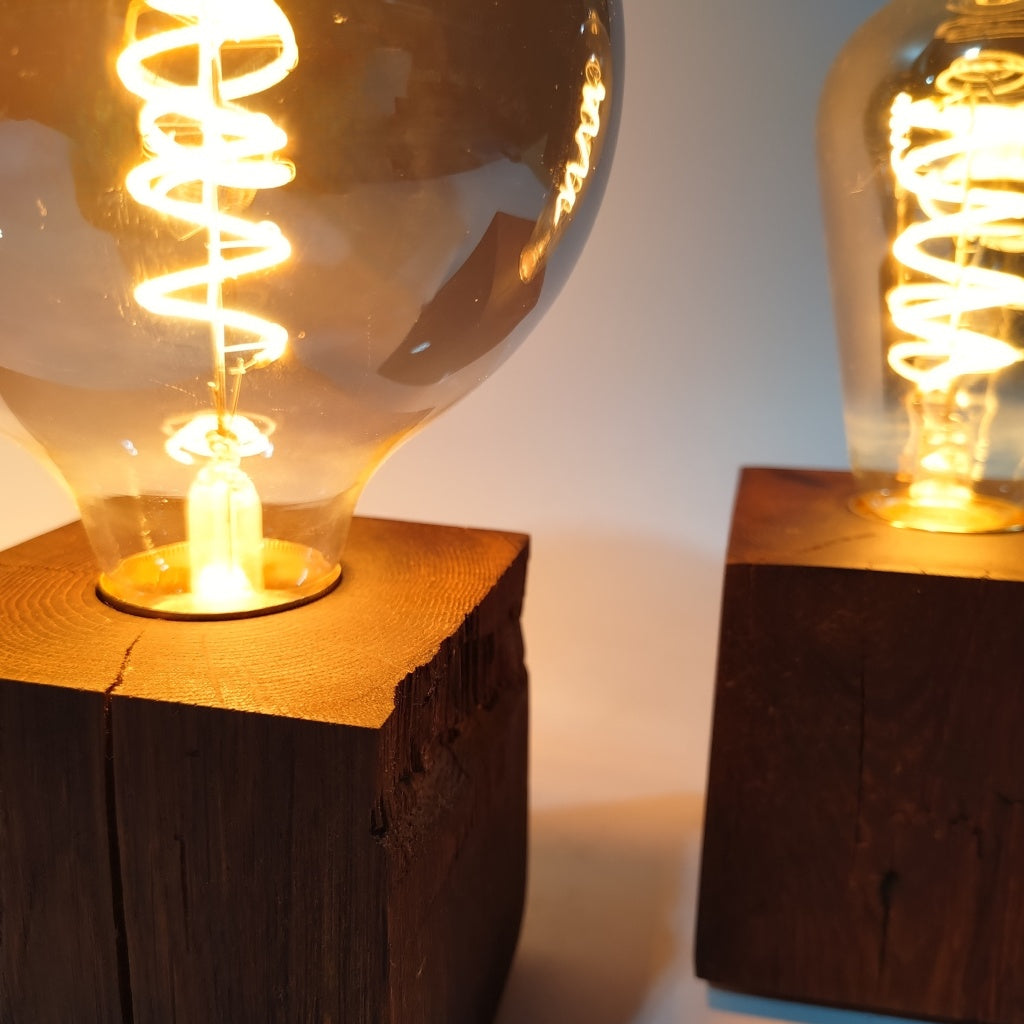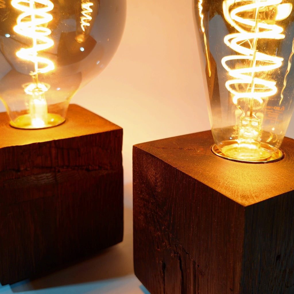 Egal wie Sie Ihre Tischleuchte ausstatten, sie ist ein kunstvoller Blickfang für Ihr Interieur. Aus dem Herzen antiker Eichenbalken wurden Würfel in 9x9x9cm heraus geschnitten. Diese wurden mit Löchern für Kabel und Fassung verstehen und anschließen geschliffen und geölt. Zur Sicherstellung eines stabilen und schonenden Stands, befinden sich auf der Unterseite vier Gummifüße.