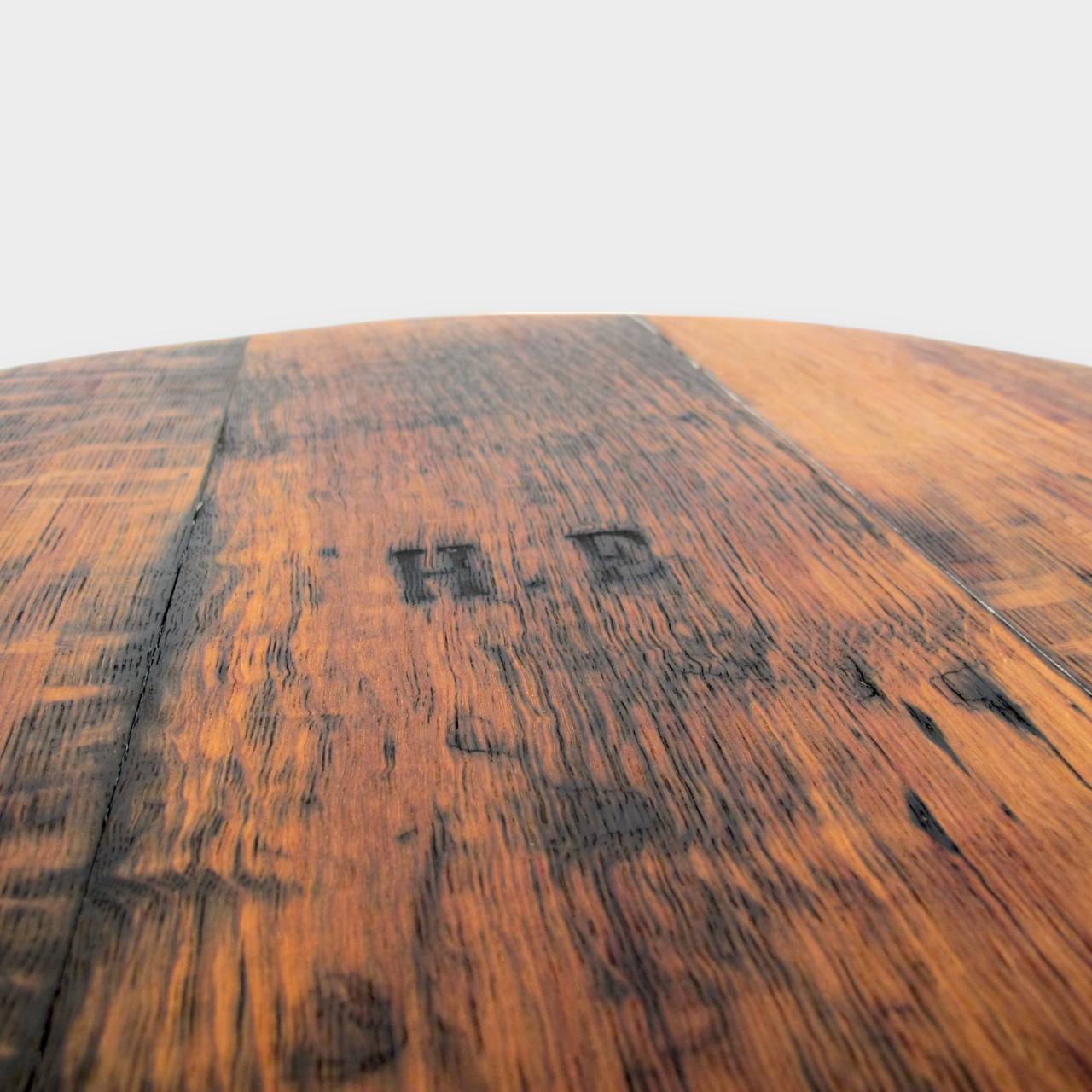 Als Basis für die Tischplatte unserer Beistelltische und für unsere Wanduhren verwenden wir ausgewählte Fassdeckel von Wein- und Whiskyfässern. Dies ist auch im aufgearbeiteten Zustand noch an den unterschiedlichen Prägungen der Winzer, Brennereien oder Fasshersteller zu erkennen. Bei den Deckeln alter Rotweinfässer auch sehr deutlich an der rötlichen Verfärbung der Unterseite erkennbar.