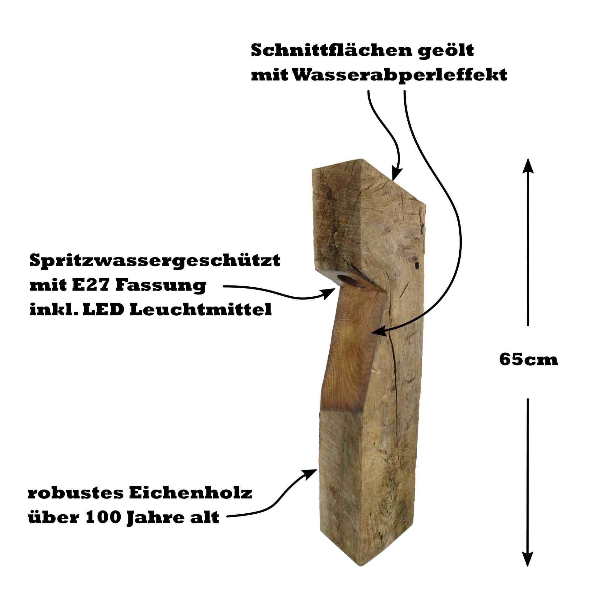 In Handarbeit aus alten Fachwerkbalken gefertigt, fügt sich unsere Gartenlampe perfekt in jede Umgebung ein, beleuchten Sie Ihren Weg und präsentieren Sie gleichzeitig ein Stück Geschichte. Durch die Verwendung hochwertiger Materialien ist Nüri langlebig und perfekt für den Außenbereich geeignet.