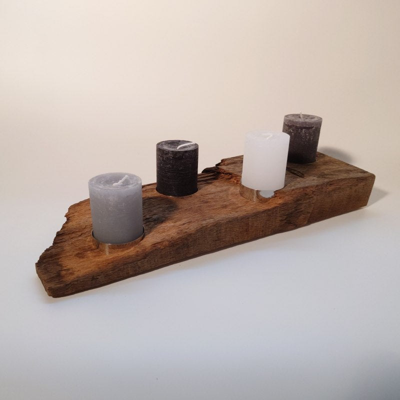 Perfekt für die Adventzeit oder auch das ganze Jahr über als Deko-Element im Wohnzimmer. Unsere Kerzenständer bestehen aus einem ausgewählten Eichenholzstück und 4 Edelstahl Kerzenfassungen, welche passgenau ins Holz eingelassen und dort verklebt sind.