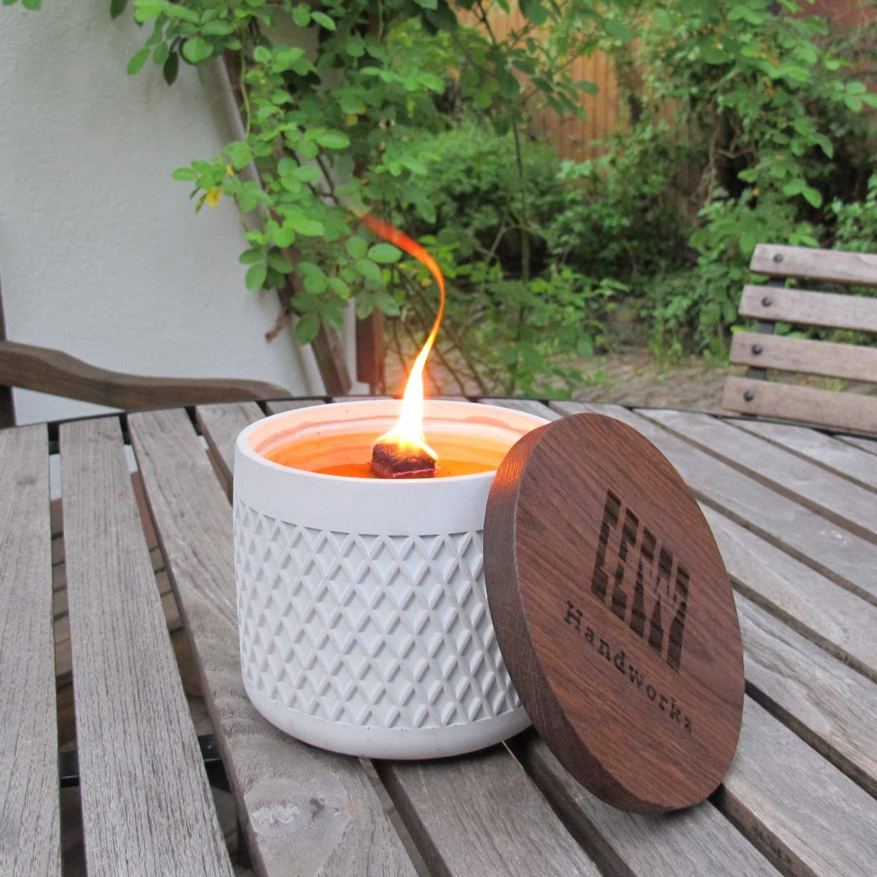 Eingefasst in hochwertigem Beton und in den Farben grau und anthrazit erhältlich. Gefüllt mit 900g Bio-Sojawachs und einem Dauerdocht aus Echtholz, der Boden ist mit Filzfüßen versehen, um einen schonenden Stand zu gewährleisten. Das brodelnde Feuer, welches in ihm schlummert, wird mit edlem Löschdeckel aus altem Eichenholz und geschliffener Edelstahlplatte in Schach gehalten, denn selbst stärkere Böen können Ugni nicht ausblasen!