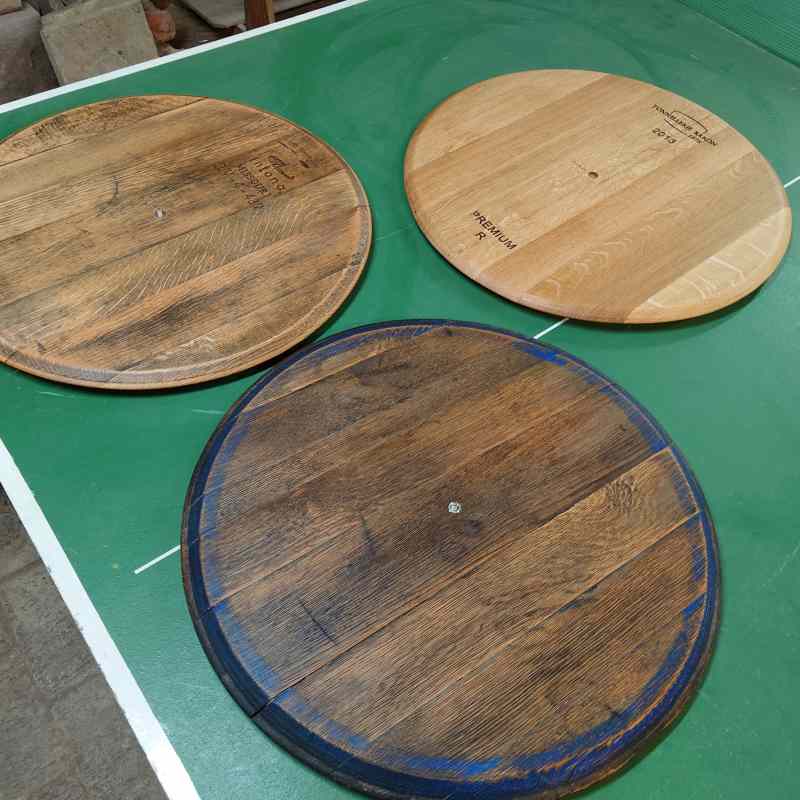 Als Basis für die Tischplatte unserer Beistelltische und für unsere Wanduhren verwenden wir ausgewählte Fassdeckel von Wein- und Whiskyfässern. Dies ist auch im aufgearbeiteten Zustand noch an den unterschiedlichen Prägungen der Winzer, Brennereien oder Fasshersteller zu erkennen. Bei den Deckeln alter Rotweinfässer auch sehr deutlich an der rötlichen Verfärbung der Unterseite erkennbar.